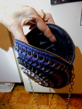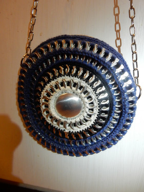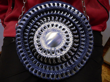 Laukku on tehty nipsuista ja virkattu tumman sinisellä mustalla ja valkoisella langalla.